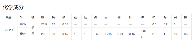 GH32高温合金具有良好的抗氧化和耐腐蚀性能,在900°C以下有中等的持久和蠕变强度,冷、热加工成形性和